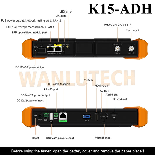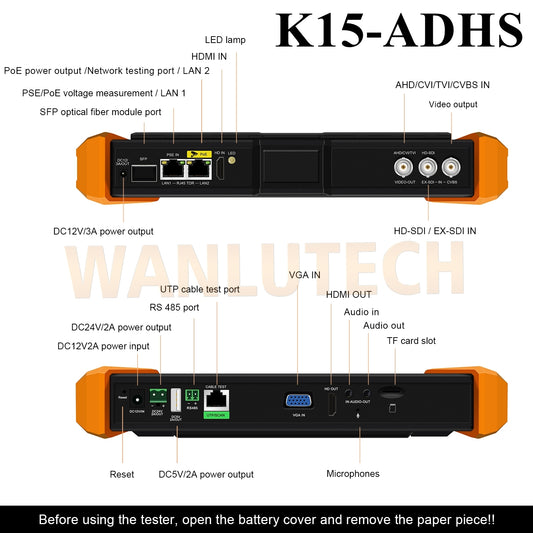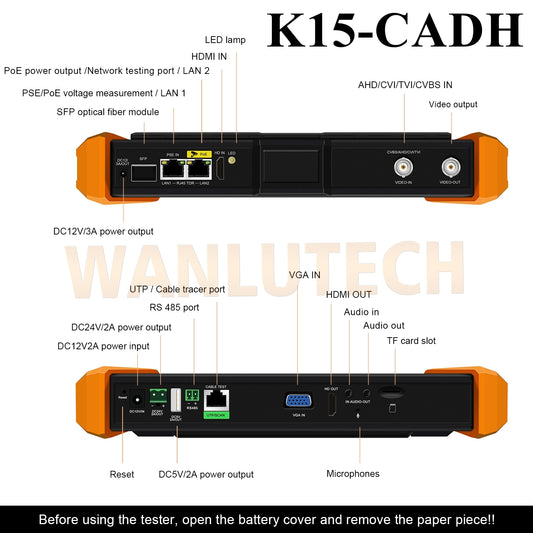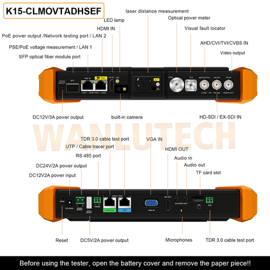 WANLUTECH 8K IP Camera Tester with PoE, CCTV Tester Support 8MP AHD CVI TVI SDI CVBS Camera Test SFP Test OPM VFL DMM Cable Tracer TDR Cable Test HDMI in VGA in (K15-CLMOVTADHSEF)