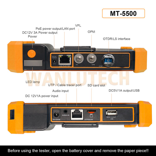 WANLUTECH Single Mode OTDR Fiber Optic Tester, MT-5500 1310/1550nm 28/26dB 5.4'' Touchscreen OTDR Event Map OPM OLS VFL 4K IP Camera Test Cable Tracer RJ45 Cable TDR Test PoE Power Output Network Tools