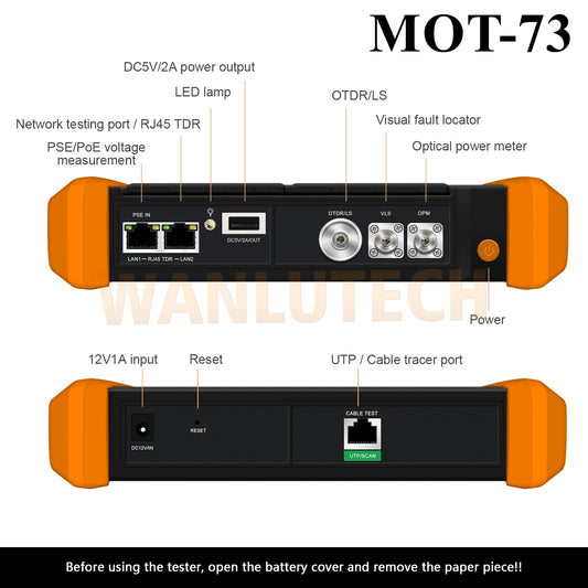 WANLUTECH Single Mode Optical Fiber Tester, MOT-73 1310/1550nm 28/26dB 7'' Touchscreen OTDR Tester Built-in VFL OPM LS(Light Source) Event Map OLT (Optical Loss Test) Functions RJ45 Cable Tester Network Tools