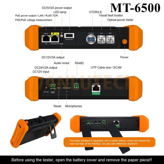 Probador de fibra óptica OTDR monomodo WANLUTECH, probador CCTV OTDR MT-6500, 1310/1550 nm, 28/26 dB, pantalla táctil de 5,4", OTDR, OPM, OLS, VFL, mapa de eventos, compatible con cámara IP 4K, rastreador de cables, PoE, RJ45, prueba TDR de cable